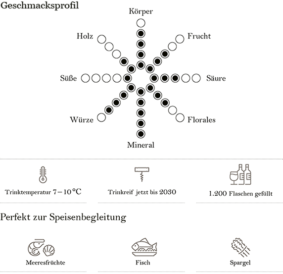 Sein komplexes, mineralisches Bouquet mit Zitrusnoten, feinen Röstaromen und Kräutern sowie seine elegante Frische und der edle, salzige Nachhall verdanken sich auch dem behutsamen Herstellungsverfahren. Schonend und langsam erfolgt die Pressung. Der Most ruhte 24 Stunden, bevor die langsame alkoholische Gärung in französischen Eichenfässern begann. Anschließend reifte der Wein 18 Monate in Holzfässern und absolvierte die malolaktische Gärung vollständig.