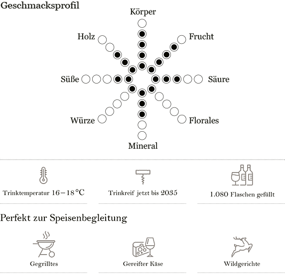 Dieser Wein zeichnet sich durch seine klare, strohgelbe Farbe und charakteristische Riesling-Aromen aus. Die Nase offenbart feinfruchtige Nuancen, die durch subtile Reifenoten bereichert werden. Am Gaumen kommen reife Fruchtaromen, insbesondere Apfel, zur Geltung, die harmonisch eingebunden sind. Mit einer soliden Struktur und trockenem Charakter besticht er durch einen langen Abgang, während der Nachhall von angenehm reifer Frucht geprägt ist.